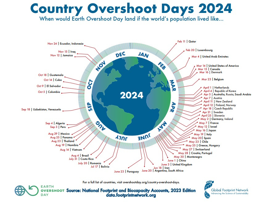 ‘Overshooting’ late in the year, despite populations living far less wantonly consumptive existences, Indonesia, which includes vast tracts of biodiverse forest, and Ecuador, which includes some of the Amazonian rainforest, are also nonetheless, still in ecological overshoot.
