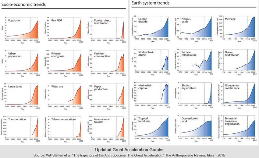 These are then juxtaposed against the second set of graphs in blue depicting earth-systems which follow conspicuously similar trajectories – carbon dioxide, ocean acidification, tropical forest loss, terrestrial biosphere degradation, etc. etc… The relationship is all too clear: the history of human progress is fundamentally entwined with the history of planetary destruction.