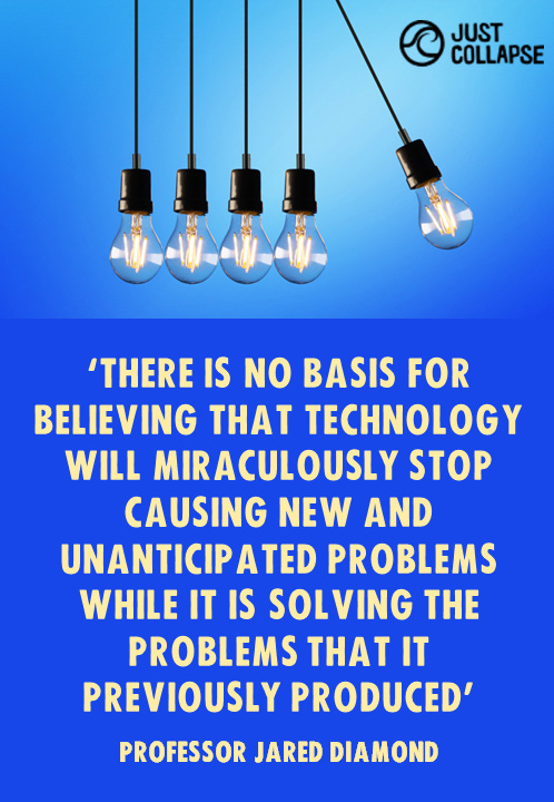 Techno-fixes. They’re everywhere! Author of the seminal book titled ‘Collapse – How Societiess Choose to Fail or Succeed”, Professor Jared Diamond wrote – “All of our current environmental problems are unanticipated harmful consequences of our existing technology. There is no basis for believing that technology will miraculously stop causing new and unanticipated problems while it is solving the problems that it previously produced.” Ergo – more of the problem is never the solution. Once upon a time, Abert Einstein suggested that endlessly repeating an experiment and hoping for different results, is the definition of insanity.